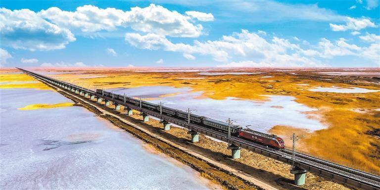 2025年10月8日,火车驶过位于若羌县城北部的台特玛湖。陈国权摄(中经视觉)
