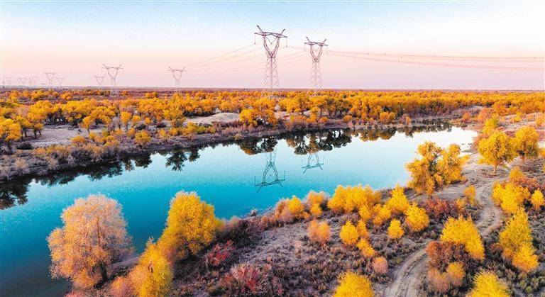 2025年10月17日,若羌县境内的巴州—罗布泊—若羌750千伏输变电工程穿越塔里木河。马 元摄(中经视觉)