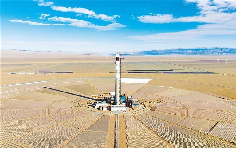 2025年12月18日拍摄的新疆若羌县10万千瓦光热(储能)配套90万千瓦光伏发电项目现场。该项目是新疆海拔最高的塔式熔盐光热项目。许峻豪摄(中经视觉)