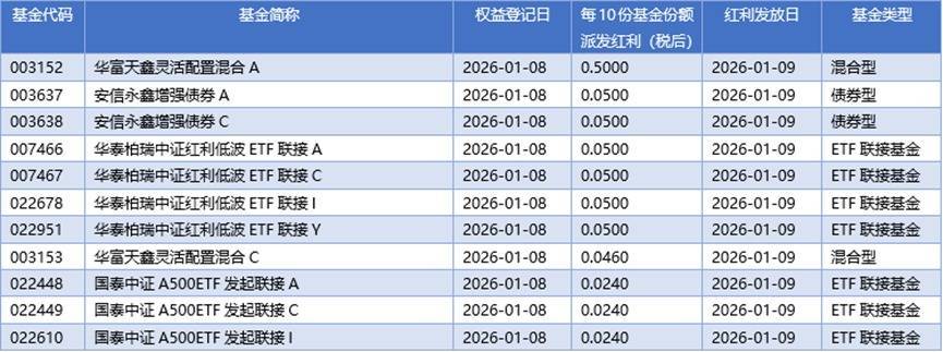(1)01月08日新发基金共有12只,主要为混合型基金和股票型基金,其中招商中证有色金属矿业主题ETF联接A募集目标金额达30.00亿元;基金分红11只,多为ETF联接基金,派发红利最多的基金是华富天鑫灵活配置混合型证券投资基金,每10份基金份额派发红利0.5000元。
